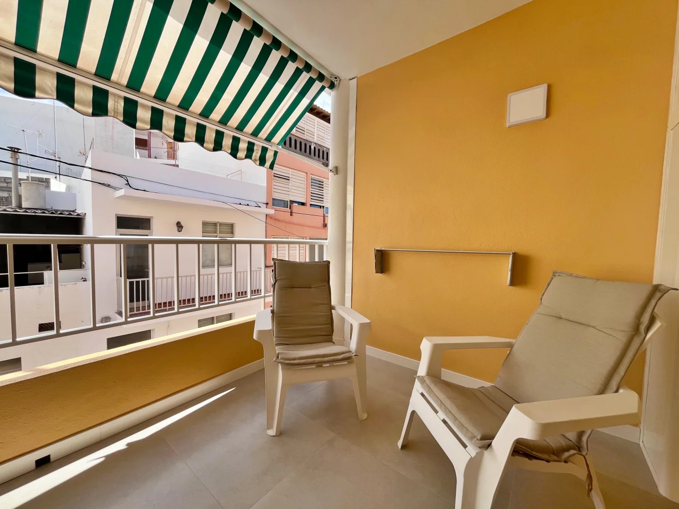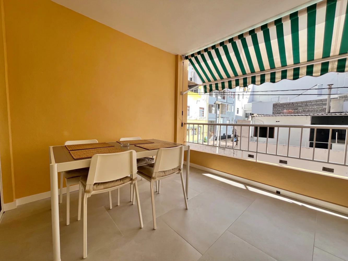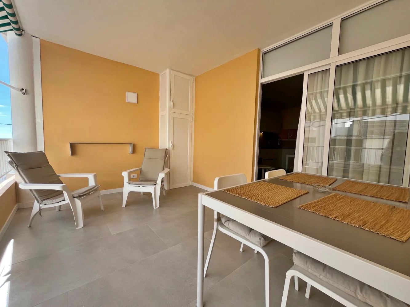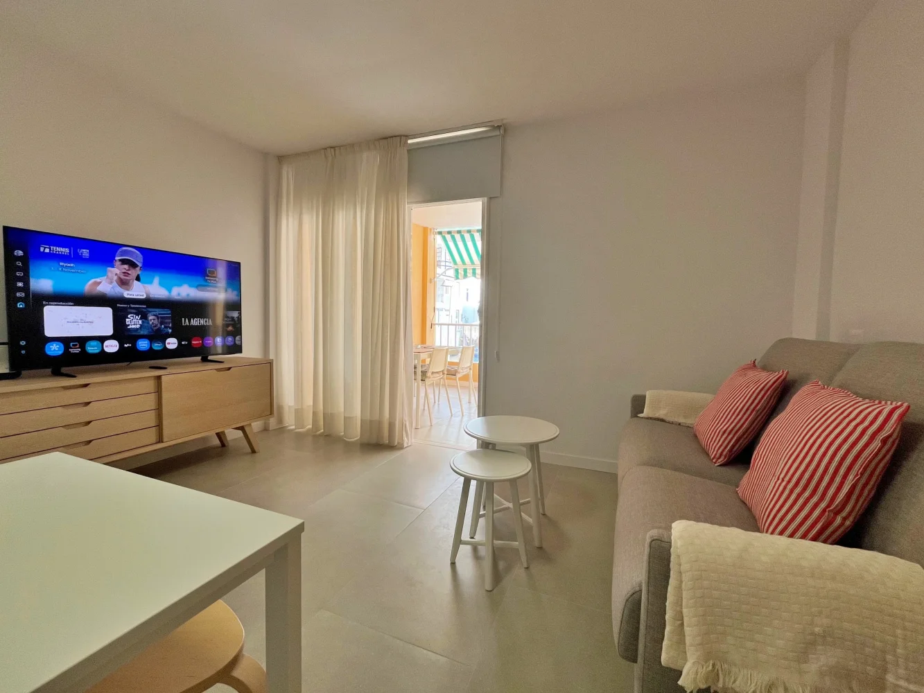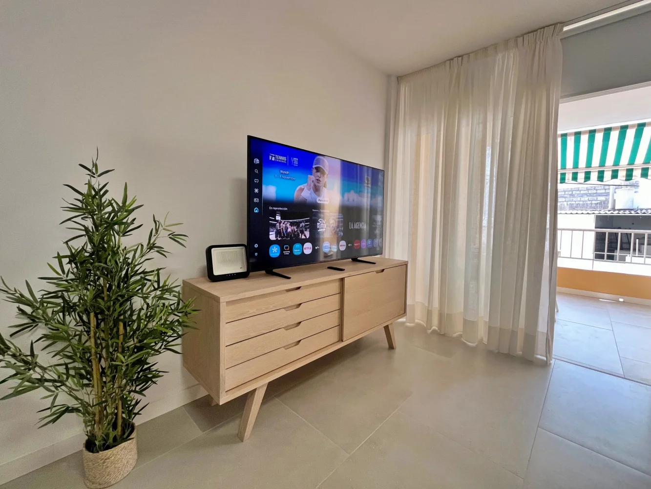 Wohnzimmer: Smart TV, Satellitenfernsehen mit deutschen Programmen, spanisches Fernsehen, Tisch mit zwei Hockern, Zugang zur Terrasse