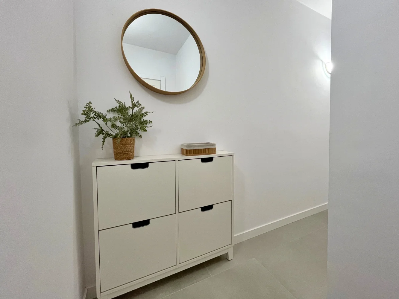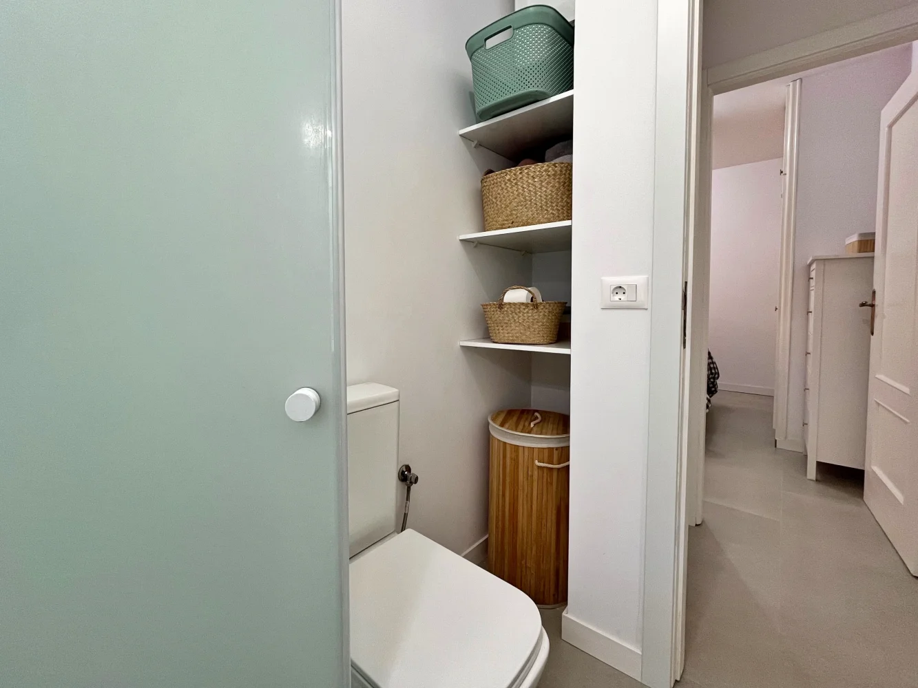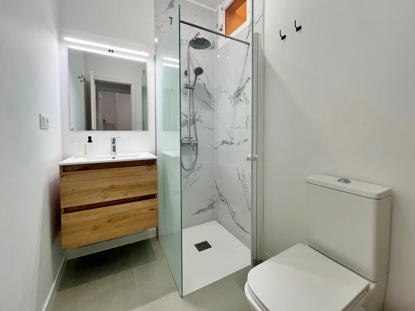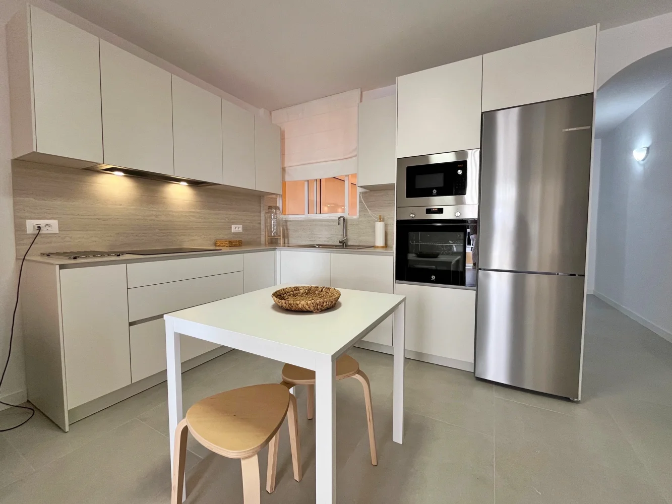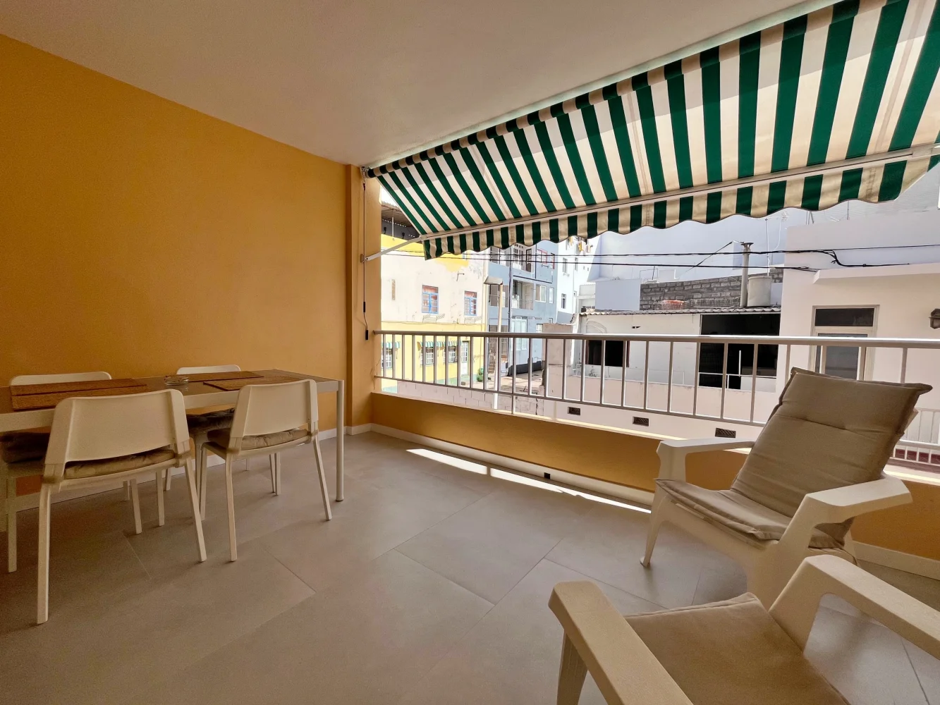 Wohnzimmer: Smart TV, Satellitenfernsehen mit deutschen Programmen, spanisches Fernsehen, Tisch mit zwei Hockern, Zugang zur Terrasse