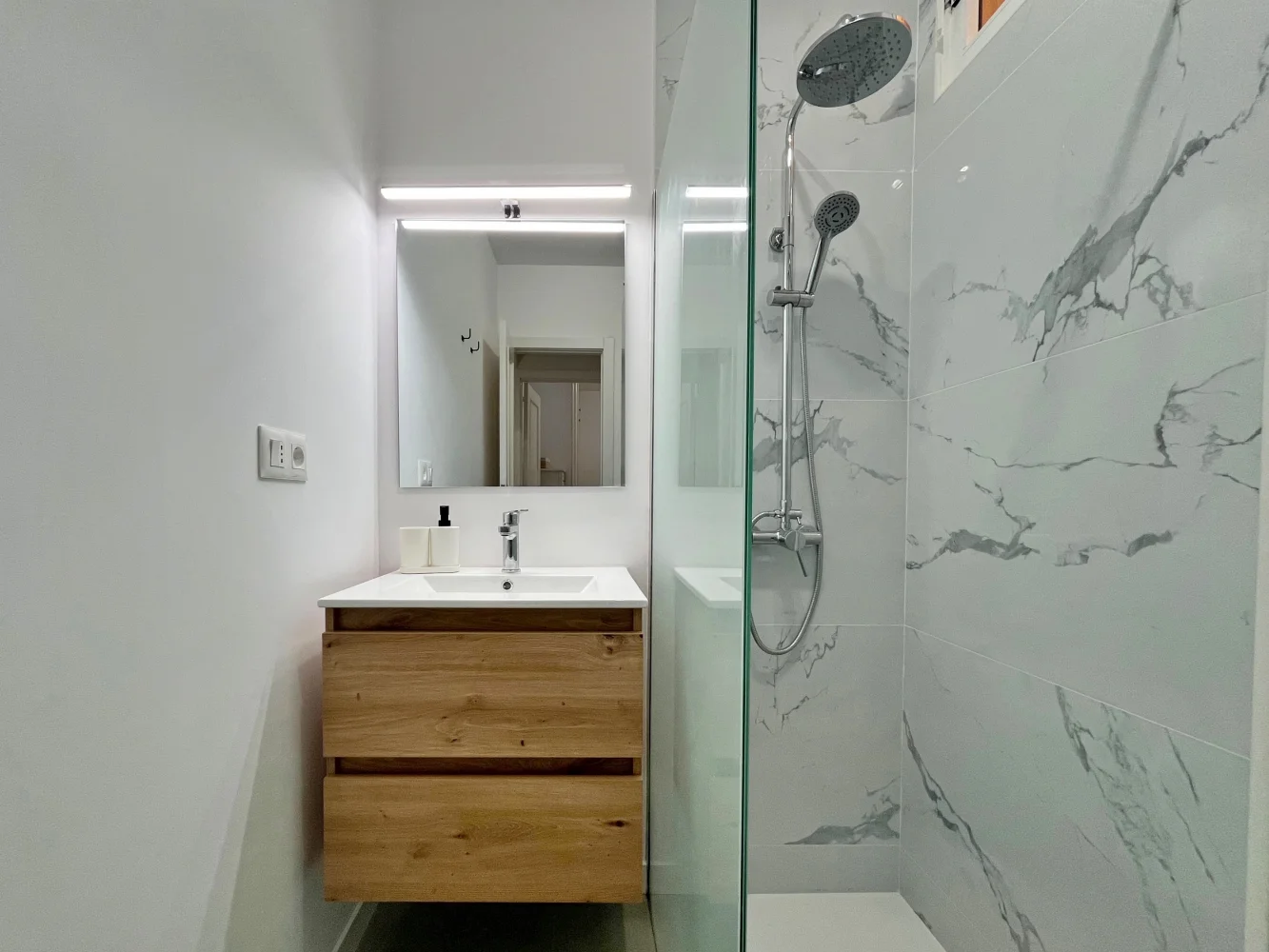 Badezimmer: Dusche, Handwaschbecken, WC, Föhn