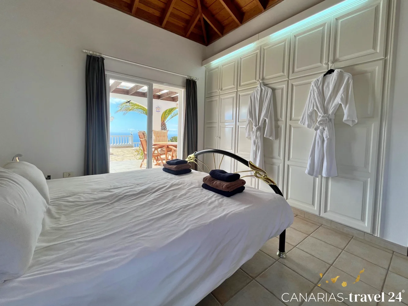 Schlafzimmer 1: Doppelbett (180 cm x 200 cm), Nachttische mit Lampen, Wandschrank, Zugang zur Terrasse, en-suite Badezimmer