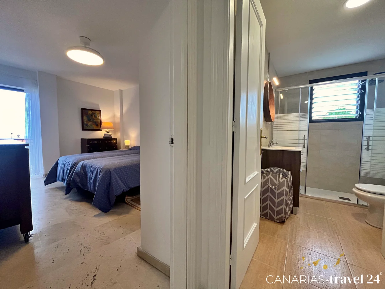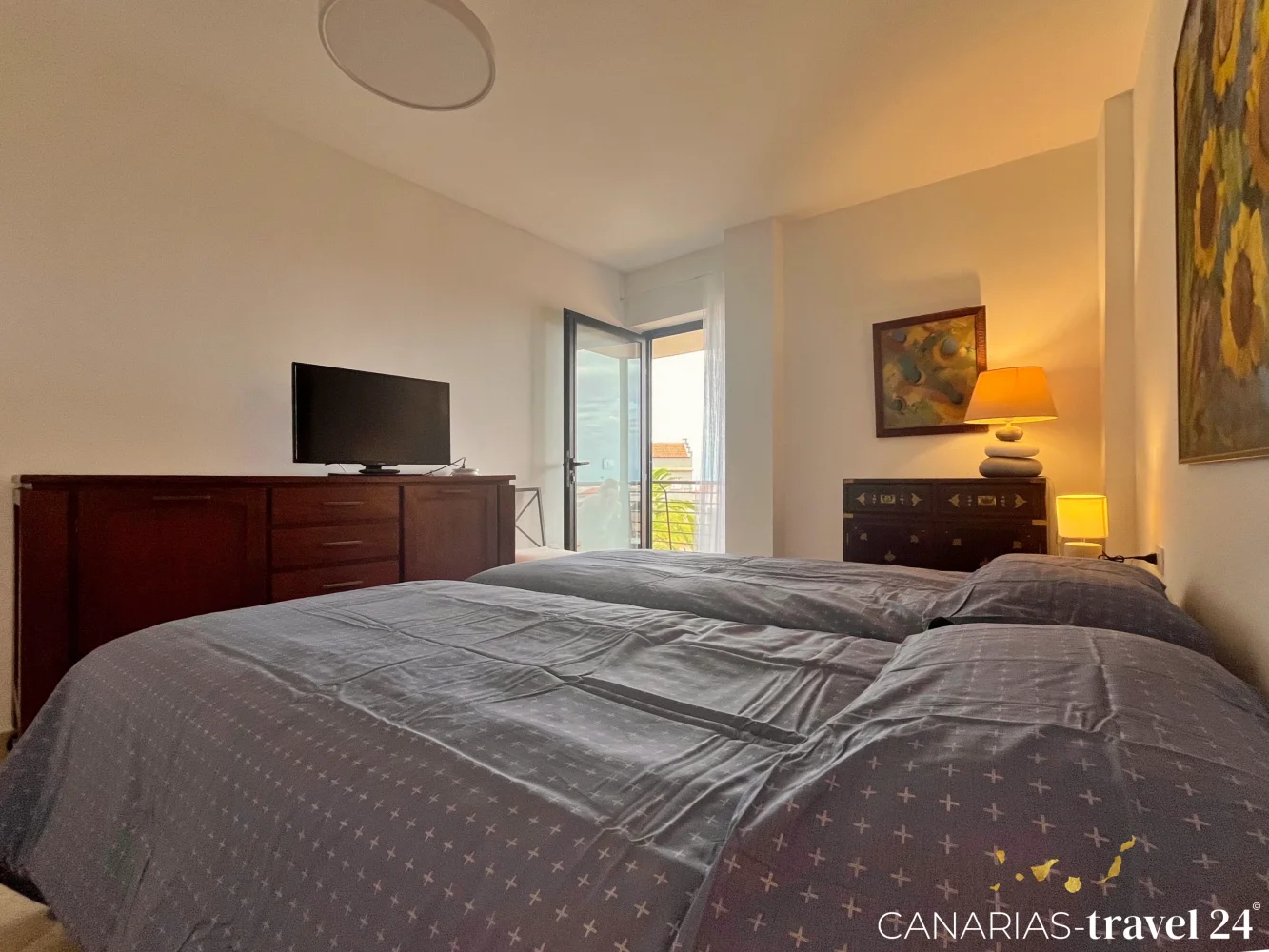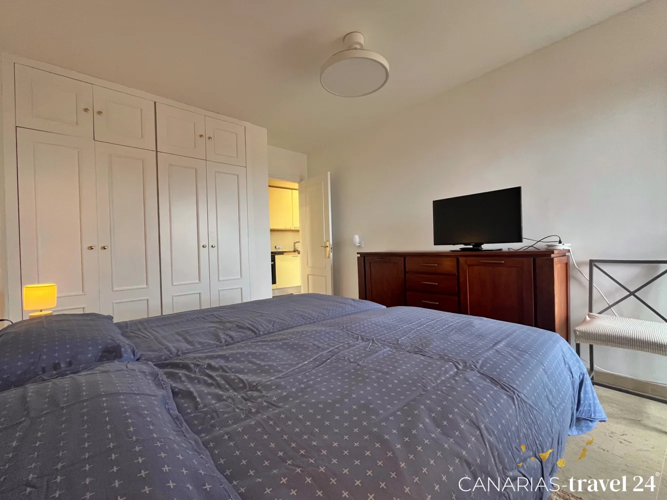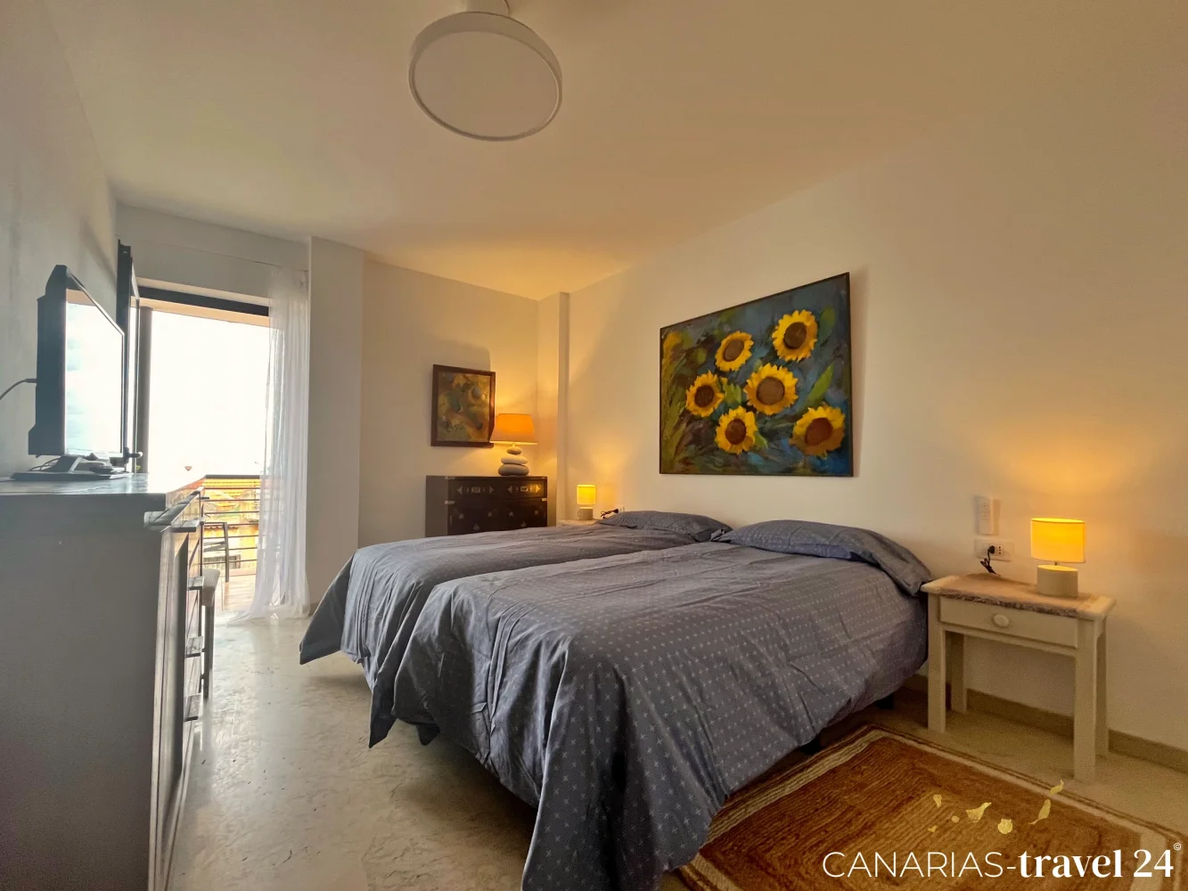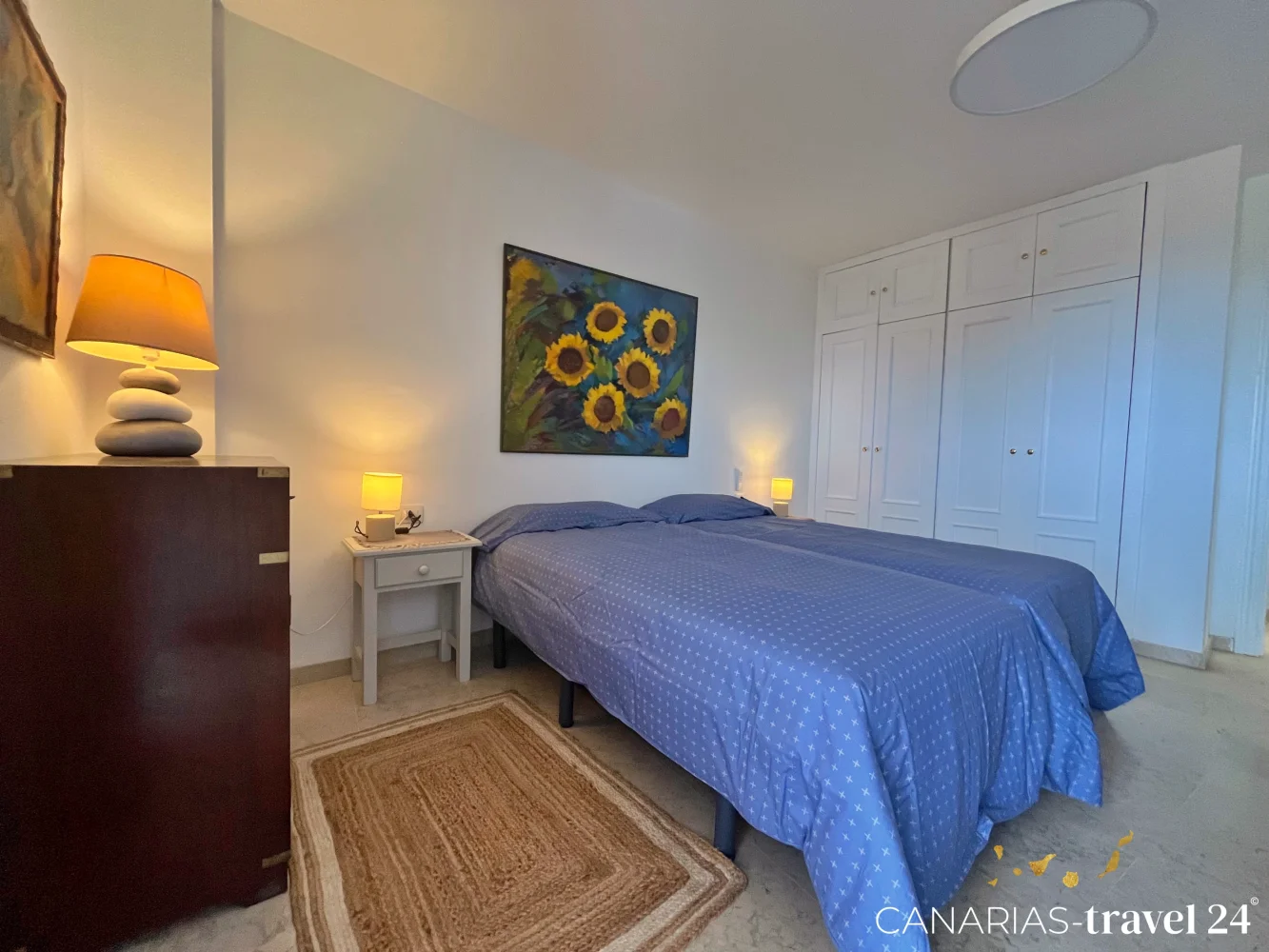 Schlafzimmer: zwei Einzelbetten die als Doppelbett gestellt sind (je 90 cm x 190 cm), Nachttische mit Lampen, Schrank