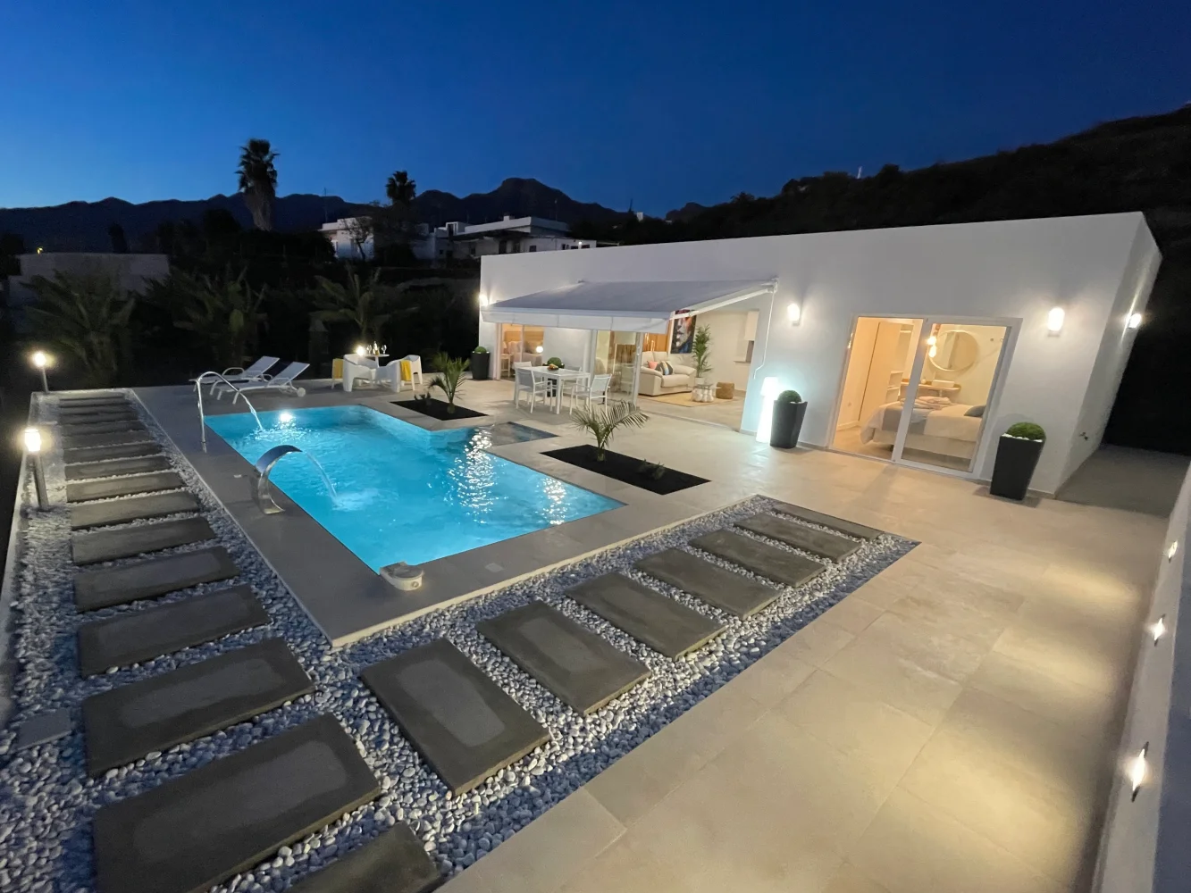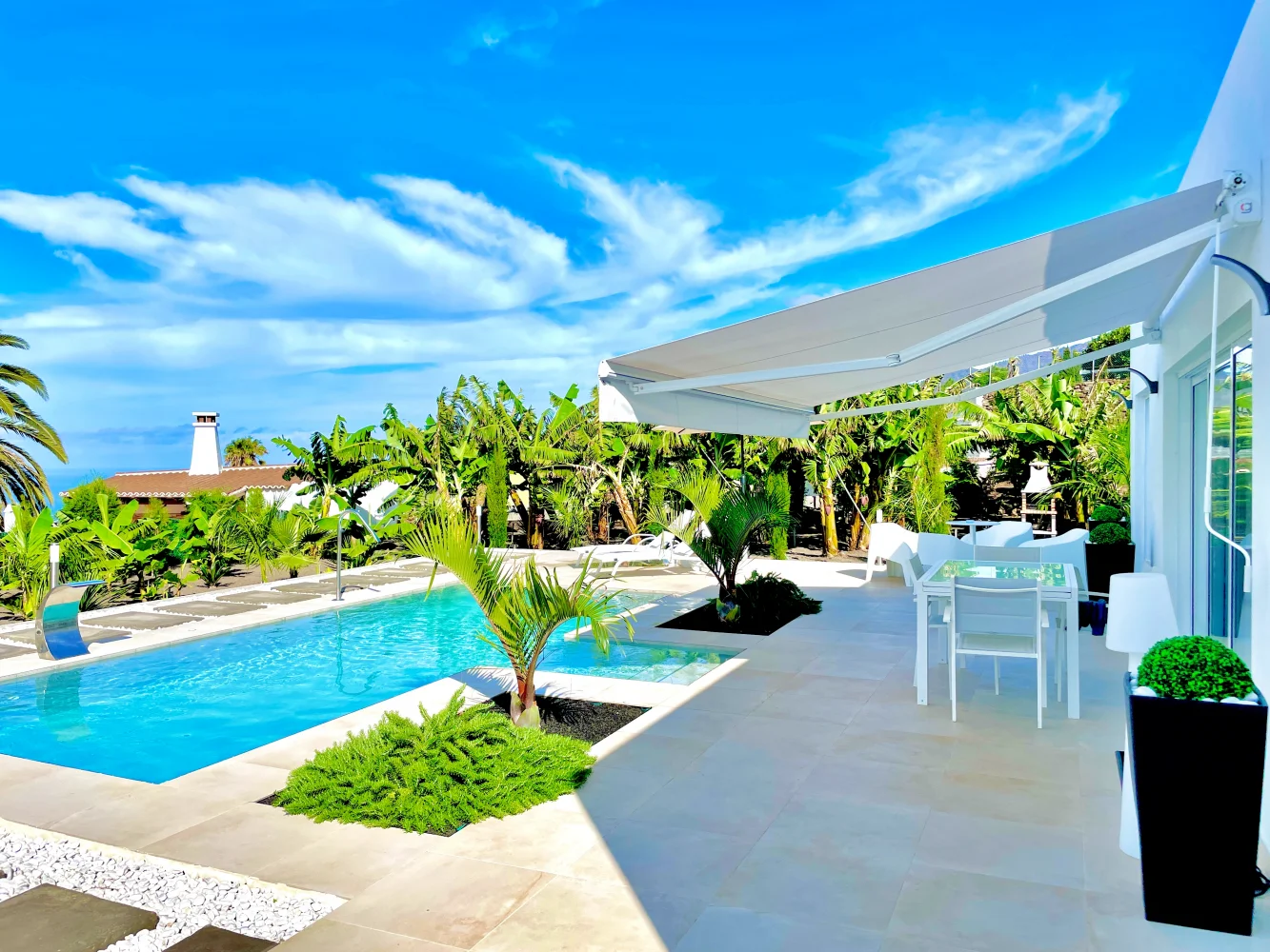 Außenbereich: Beheizter Pool, Sonnenliegen, Sonnenschirm, Terrasse mit Markise, Esstisch, Sitzgruppe, Grill