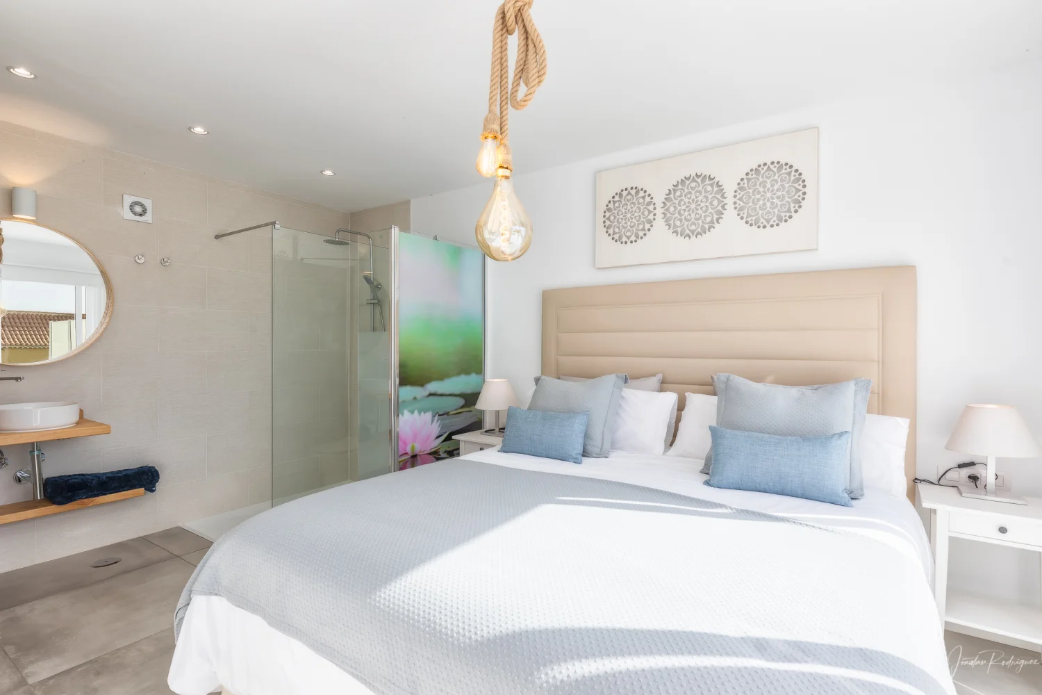 Bedroom 1: Double bed (180 cm x 200 cm), bedside tables with lamps, wardrobe, TV, access to terrace, en-suite bathroom with shower, washbasin, WC and hairdryer