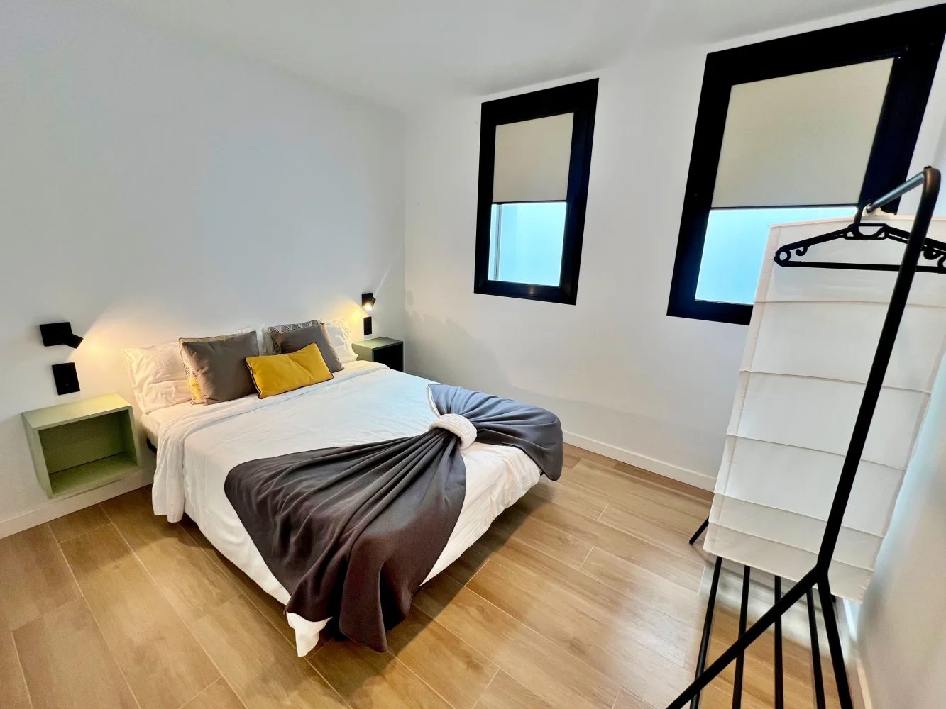 Bedroom 2: Double bed, bedside tables, reading lamps, clothes rack with hangers
