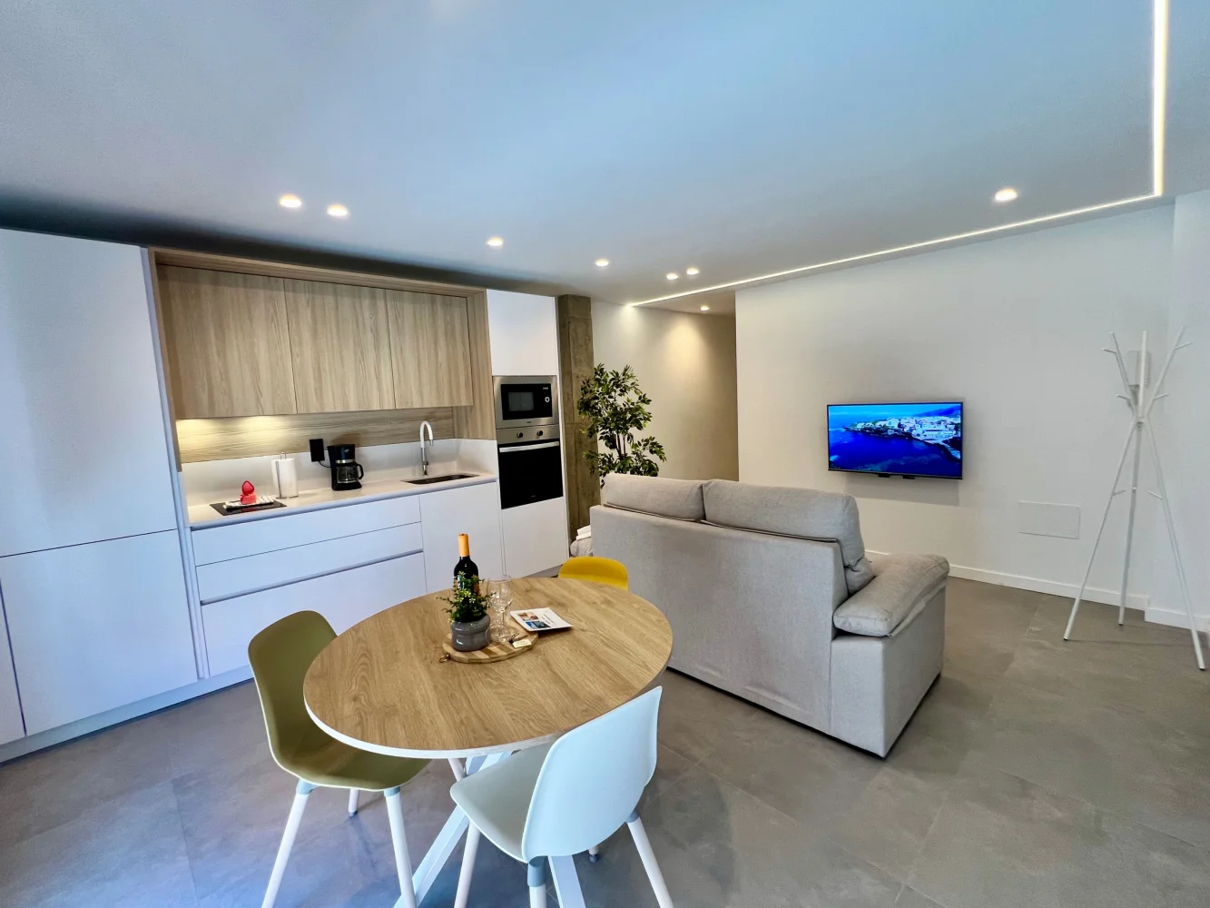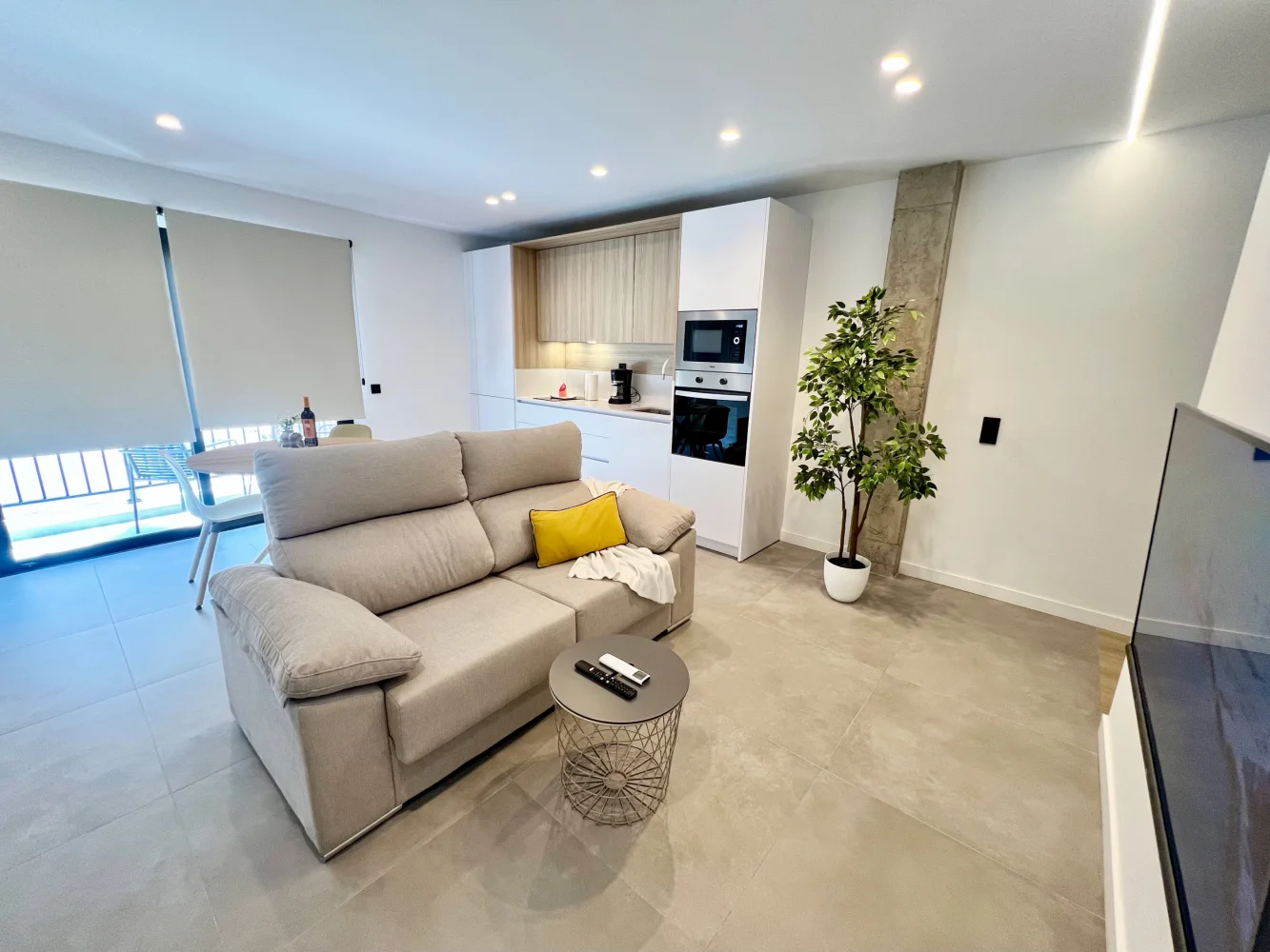 Living room: Smart TV, Spanish television, air conditioning, dining table with three chairs, access to the balcony