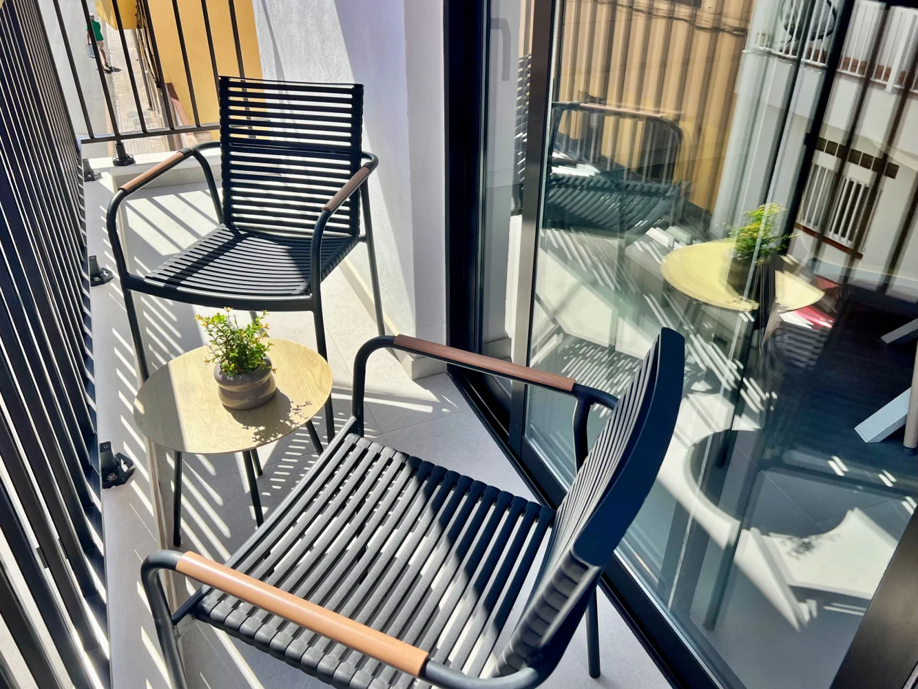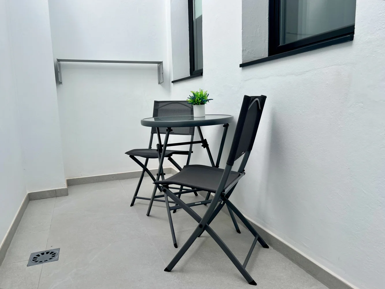 Outdoor area: Private inner terrace with table and chairs, furnished balcony with table and chairs