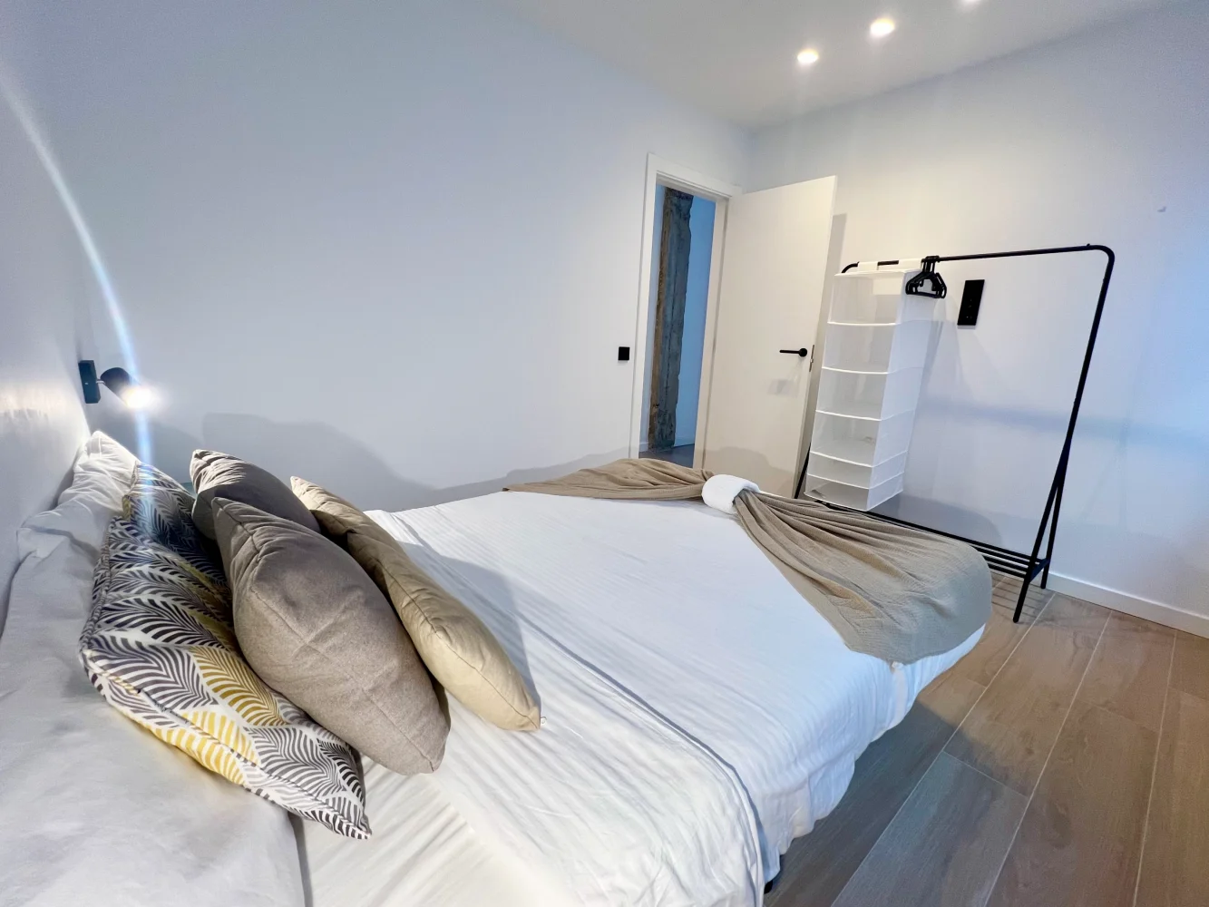 Bedroom 1: Double bed, bedside tables, reading lamps, clothes rack with hangers