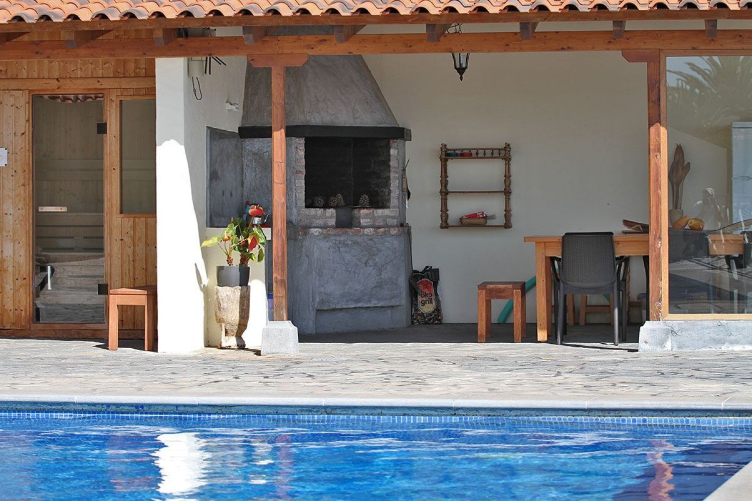 Sun deck with an 8 x 4 meter swimming pool, outdoor shower, sun loungers, covered barbecue area with seating and a sauna for shared use