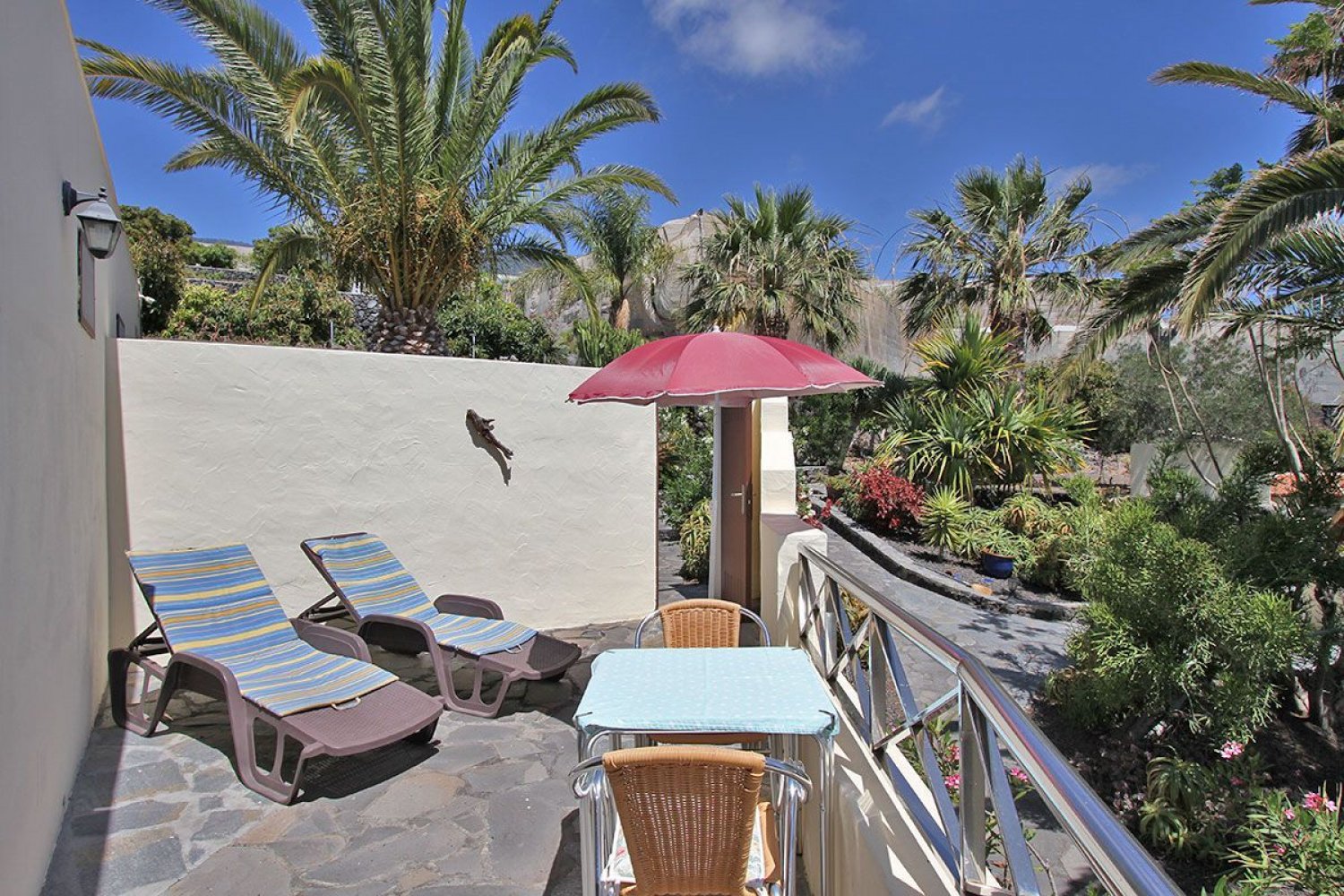 Outdoor area: Private terrace with two sun loungers, a table with two chairs and a parasol