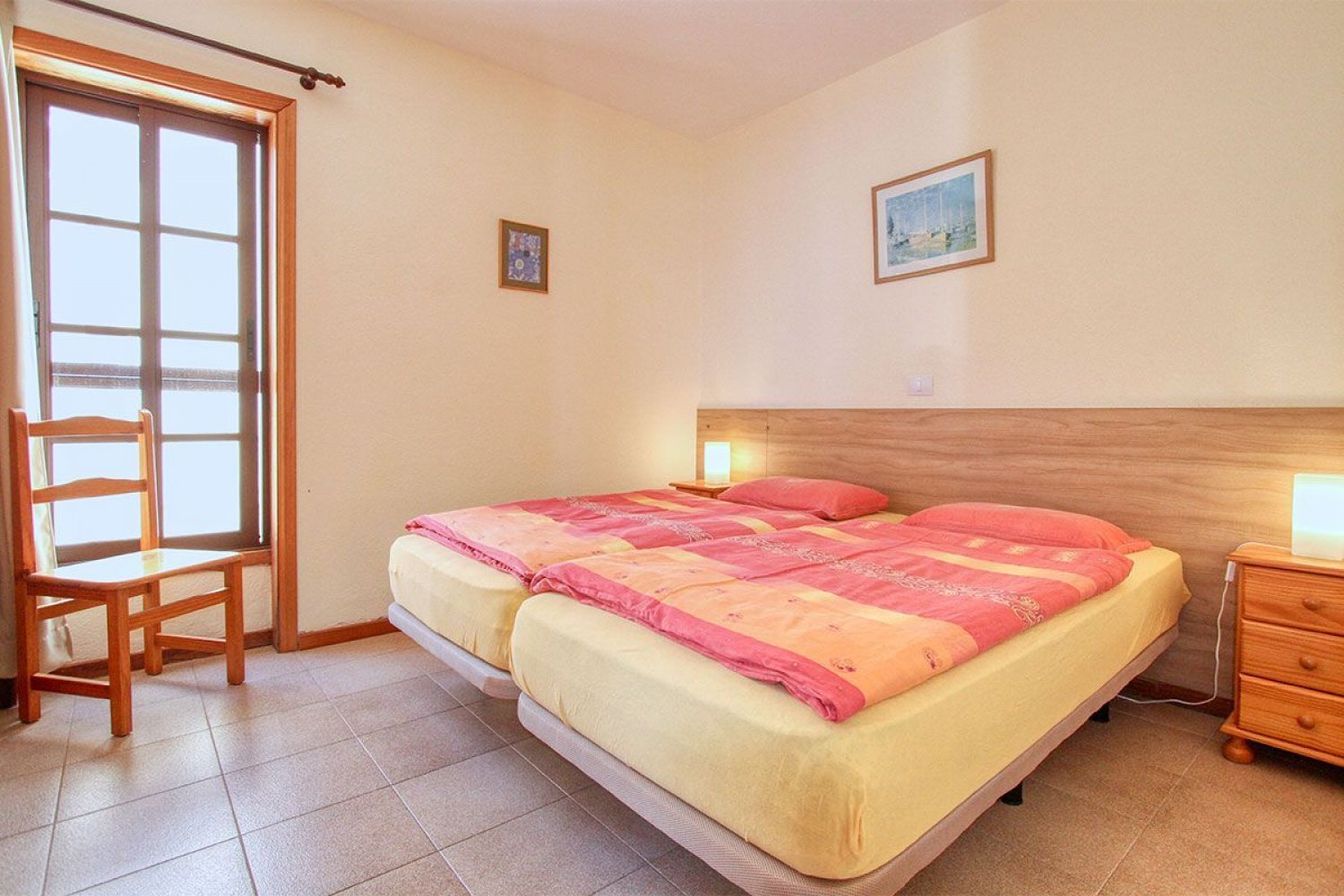 Bedroom: two single beds (each 90 cm x 200 cm) arranged as a double bed, bedside tables with lamps, wardrobe