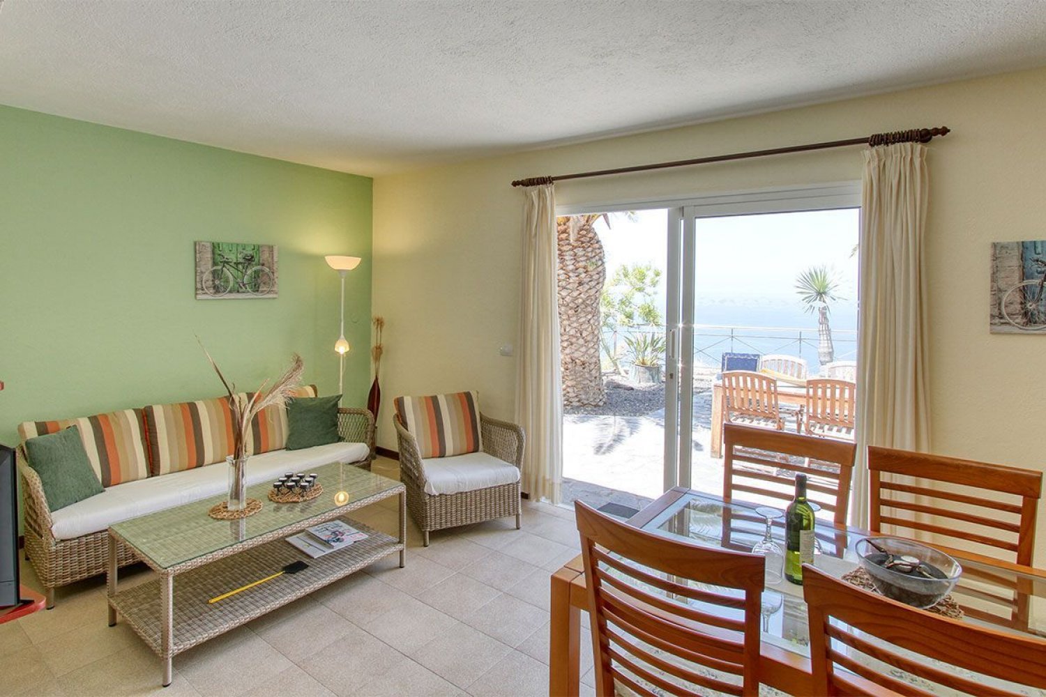 Sala de estar: Televisión por satélite, televisión española, mesa de comedor con cuatro sillas, acceso a la terraza