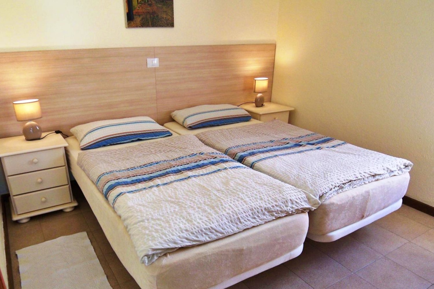 Dormitorio 1: Dos camas individuales (90 cm x 200 cm cada una) colocadas como cama doble, mesitas de noche, armario